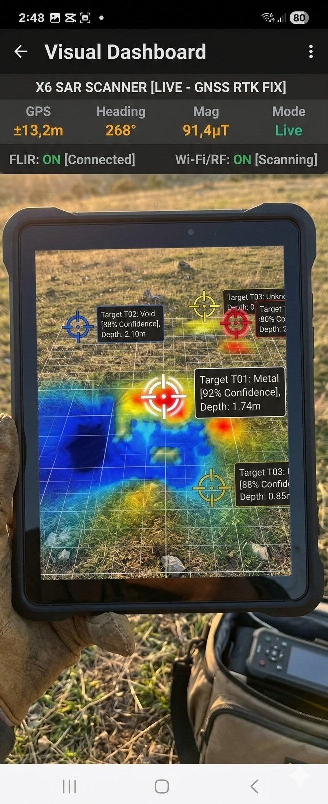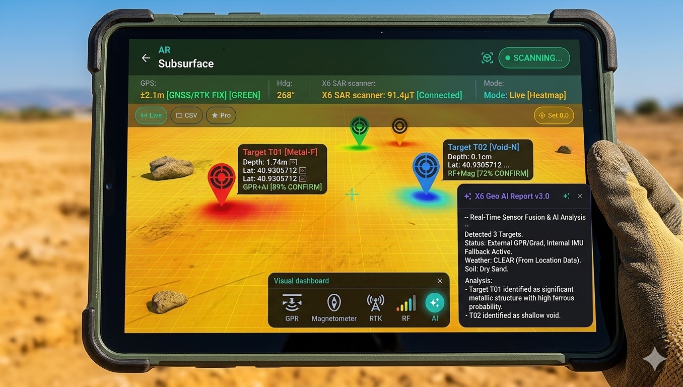 Το Visual Dashboard & Universal Hub μετατρέπει τη συσκευή σας σε έναν ολοκληρωμένο σταθμό ελέγχου για όλες τις γεωφυσικές σας ανάγκες. Αυτό το κεντρικό πάνελ ενσωματώνει δεδομένα από διάφορες πηγές, συμπεριλαμβανομένων των συστημάτων GPR, Γραδιόμετρου, RTK GPS με ακρίβεια εκατοστού, και Θερμικών καμερών FLIR. Αυτή η ενοποίηση πολλαπλών τεχνολογιών επιτρέπει μια πιο ολοκληρωμένη κατανόηση του υπεδάφους. Επιπλέον, η λειτουργία RF Wi-Fi Scanning Detection προσφέρει μια μοναδική δυνατότητα ανίχνευσης μέσω ραδιοσυχνοτήτων. Αυτή η τεχνολογία είναι ιδιαίτερα χρήσιμη για τον εντοπισμό κενών και άλλων ανωμαλιών σε περιπτώσεις όπου οι παραδοσιακοί αισθητήρες μπορεί να δυσκολεύονται, όπως σε πολύ πυκνά υλικά ή σε δύσκολες γεωλογικές συνθήκες. Σε περίπτωση απώλειας σήματος από κάποιον εξωτερικό αισθητήρα, η λειτουργία Auto-Fallback ενεργοποιεί αμέσως τους εσωτερικούς αισθητήρες της συσκευής, διασφαλίζοντας τη συνεχή και αδιάλειπτη συλλογή δεδομένων, χωρίς διακοπή της έρευνας.