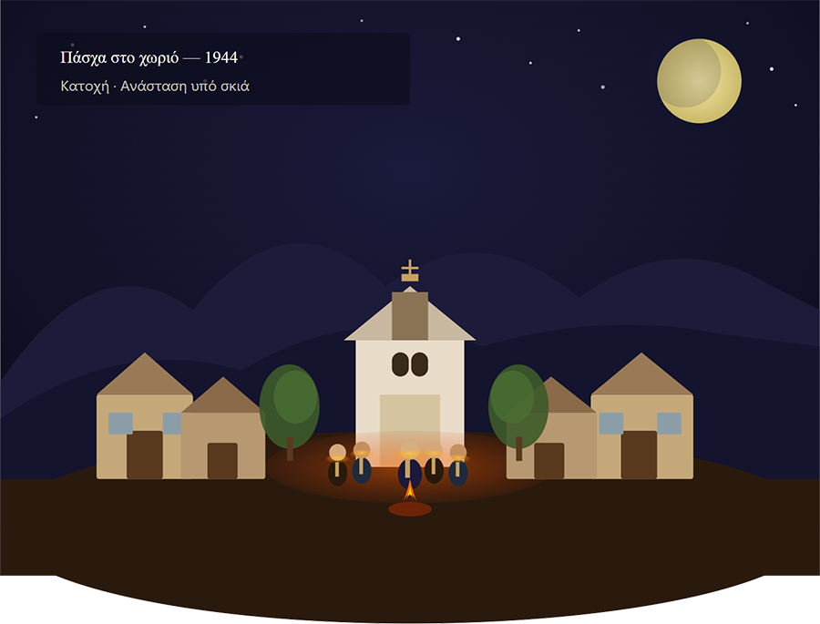 Ωστόσο, πίσω από αυτή την ειδυλλιακή εικόνα, πίσω από τους τοίχους των παλιών σπιτιών και κάτω από το χώμα που πατάμε, κρύβονται ιστορίες. Ιστορίες που ψιθυρίζονται από γενιά σε γενιά, ιστορίες φόβου, θάρρους και απώλειας, που χρονολογούνται από μια από τις πιο ταραγμένες περιόδους της σύγχρονης ελληνικής ιστορίας: τη δεκαετία του 1940. Καθώς οι παλιοί του χωριού συγκεντρώνονται γύρω από το πασχαλινό τραπέζι, τα λόγια τους συχνά γίνονται γέφυρες προς το παρελθόν. Οι αφηγήσεις τους, γεμάτες λεπτομέρειες για χαμένα αντικείμενα, κρυμμένους θησαυρούς και μυστικές κρύπτες, ζωντανεύουν έναν κόσμο όπου η επιβίωση κρεμόταν από μια κλωστή, και η γη έγινε ο σιωπηλός μάρτυρας αμέτρητων μυστικών. Αυτές οι ιστορίες, συνήθως διανθισμένες με μνήμες από την Κατοχή και τον Εμφύλιο Πόλεμο, μας καλούν να κοιτάξουμε πέρα από την επιφάνεια, να αναζητήσουμε τις σκιές των βουνών όπου «κοιμούνται» ακόμα τα μυστικά εκείνης της εποχής, περιμένοντας να «αναστηθούν» και να αποκαλύψουν την αλήθεια τους.