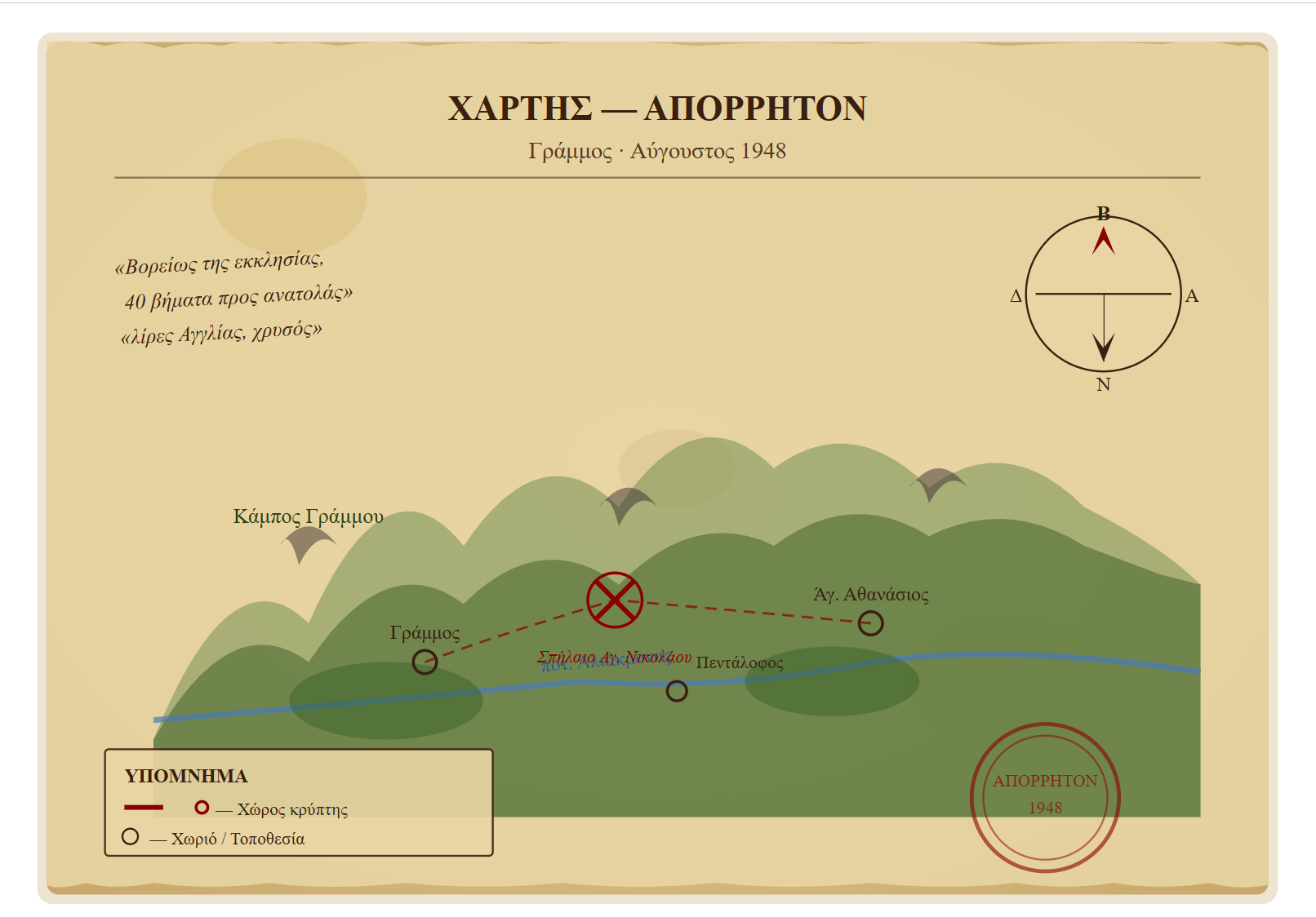 Το γεωγραφικό ανάγλυφο της Ελλάδας, με τα απέραντα βουνά, τις βαθιές χαράδρες και τα δυσπρόσιτα δάση, έπαιξε καθοριστικό ρόλο στην ιστορία της δεκαετίας του 1940. Αυτά τα φυσικά οχυρά έγιναν καταφύγια, κρησφύγετα και πεδία μαχών, αλλά και σιωπηλοί θεματοφύλακες αμέτρητων μυστικών. Σε πολλές περιοχές, τα βουνά κρύβουν ακόμα κάτω από το χώμα τους τα ίχνη μιας εποχής που καθόρισε το μέλλον της χώρας, από χαμένο Κρυμμένο Οπλισμό μέχρι Χρυσές Λίρες Αγγλίας και άλλα πολύτιμα αντικείμενα.
